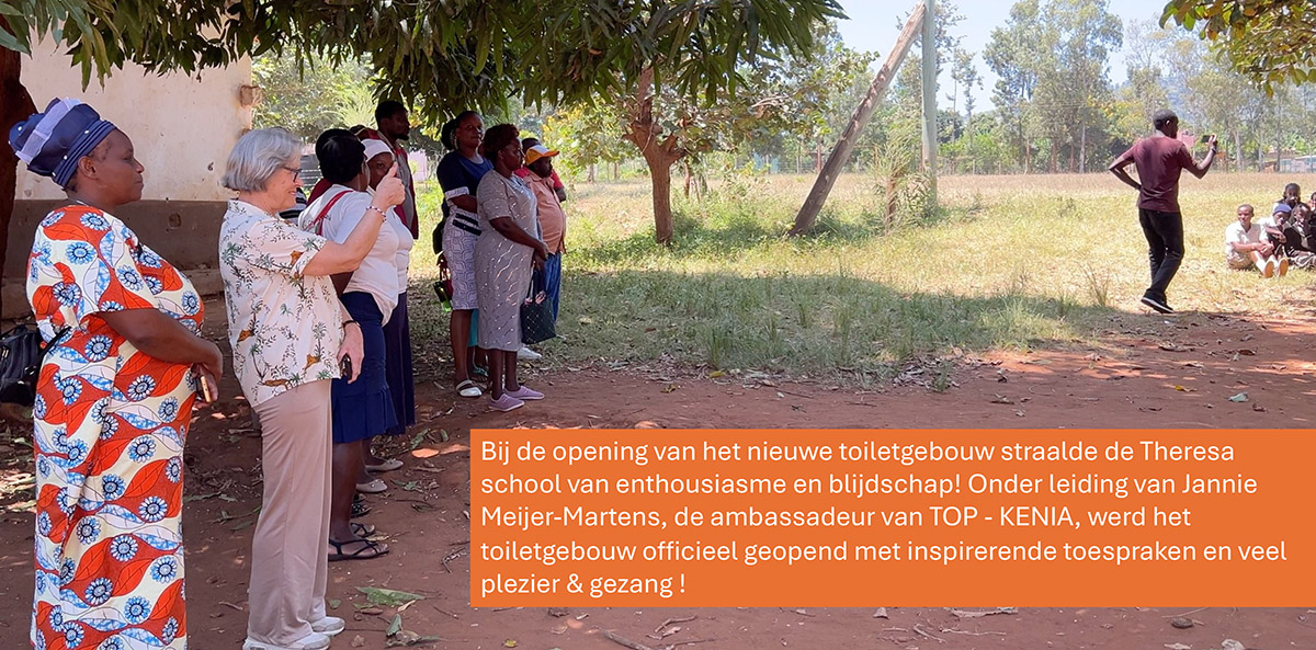 De opening van het nieuwe toiletgebouw bij St. Teresa’s School werd gevierd met veel festiviteiten. De dag begon met een vergadering met Macheo, de bestuursleden van de school en de ambassadeur van TOP, Jannie Meijer-Martens.